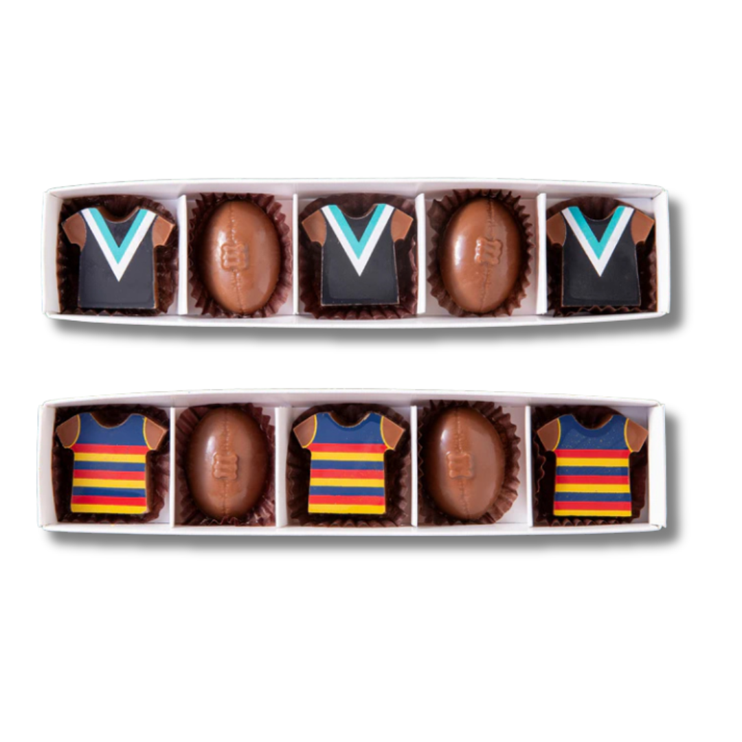 Bracegirdle's Footy Jumpers. Kick a goal in the gifting game with this set of three solid Belgian milk chocolate Footy Jumpers, packaged with two solid footballs.