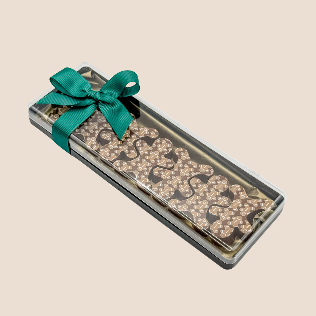 Gingerbread Babies – Gift Pack of 7. A charming pack of seven Belgian milk chocolates, with festive gingerbread filling, each finished with a playful edible gingerbread decoration. A sweet little gift to share – or keep for yourself.