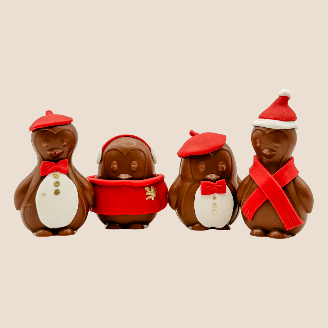 Adorable Belgian Chocolate Penguins. Hand-decorated and irresistibly delicious, these solid milk Belgian chocolate penguins are as cute as they are decadent. Perfect as thoughtful gifts or festive table decorations, each one is beautifully presented in its own gift box.